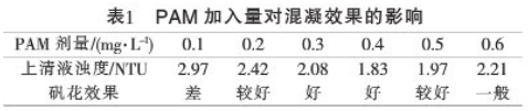 由前一輪試驗(yàn)確定以PAC作為混凝劑,投加量為15~20mg/L,根據(jù)經(jīng)驗(yàn)和試驗(yàn)數(shù)據(jù)比較后選定PAC投加量為15mg/L,在水樣溫度為28℃水樣濁度為584NTU情況下,改變PAM投加量觀察不同劑量PAM的混凝效果結(jié)果見表1。