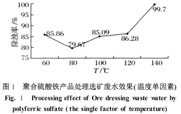 聚合硫酸鐵制備實驗中反應(yīng)溫度單因素實驗。在其他因素相同情況下調(diào)節(jié)不同的氧化溫度制備一系列的聚合硫酸鐵.取選礦廢水原水各400 mL分裝于5個500mL燒杯中,分別測定各原水濁度(約2000 NTU).加制備的聚合硫酸鐵(10gL-l)2mL(即50mgL-1聚合硫酸鐵),在混凝實驗后測定水的濁度,然后計算除濁率,見圖1.