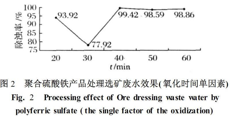 聚合硫酸鐵制備實(shí)驗(yàn)中氧化時(shí)間單因素實(shí)驗(yàn)。在其他因素相同情況下調(diào)節(jié)不同的氧化時(shí)間制備一系列的聚合硫酸鐵,而后測(cè)定其處理選礦廢水的性能,結(jié)果見圖2.