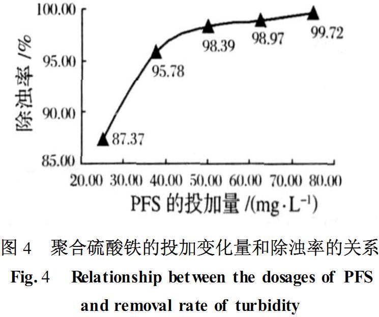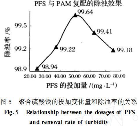 從圖4可知,在固定聚丙烯酰胺(PAM)投加量(0.25mgL-1)的條件下,隨著聚合硫酸鐵(5%)投加量的不斷增加,水樣濁度不斷下降,當投加量為75.0mgL-1的時候,濁度為8.77NTU,除濁率達到99.72%,此時水樣已是無色透明,絮體大而密實,從25.0 mgL-1~37.5mgL-1時,水中濁度下降得比較明顯;而從50mgL-1以后,除濁率的變化不是很大,亦均在98%以上,因此可以認為(50.0mgL-1聚合硫酸鐵+0.25mgL-1PAM)的復(fù)配組合較為合適.