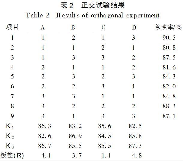 聚合氯化鋁鐵廠家華泉技術(shù)人員對采用正交試驗,優(yōu)選聚合氯化鋁鐵的制備工藝進行了研究。實驗研究中以高嶺土懸濁液的除濁率為指標(biāo)評價聚合氯化鋁鐵絮凝劑絮凝效果(投加量為80mg/L),選定反應(yīng)時間(A)、反應(yīng)溫度(B)、硫酸亞鐵投加量(C)(以每100g鋁酸鈣粉計,下同)、鹽酸投加量(D)4個因素進行試驗,確定因素水平表(見表1),按L9(34)正交表設(shè)計試驗(鋁鹽一級強化處理城市污水的正交試驗),結(jié)果如表2所示。