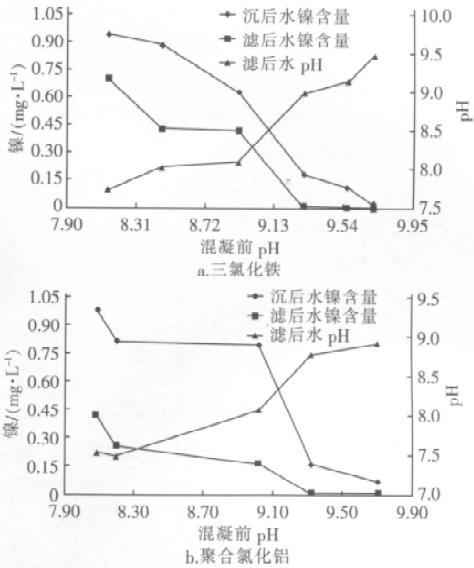 用原水配制模擬鎳污染的水樣,鎳的初始質(zhì)量濃度約為50倍的標(biāo)準(zhǔn)限值,即1mg/L,三氯化鐵和聚合氯化鋁的投加量分別為5和10mg/L(分別以Fe和Al計),不同pH值條件下鎳的去除效果如圖1所示。