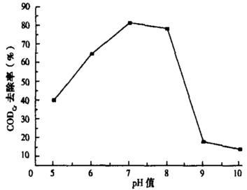 在保持絮凝劑PAC和助凝劑PAM用量不變的情況下,按照實驗方法用苛性鈉溶液或稀硫酸調(diào)節(jié)pH值,觀察pH值對CODCr去除率的影響,實驗結果見圖。