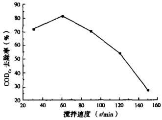上圖表明,隨著攪拌速度的提高,CODcr去除率有所提高,當攪拌速度為60r/min時,CODcr去除率最高,當攪拌速度再進一步提高時,CODcr去除率反而迅速下降。