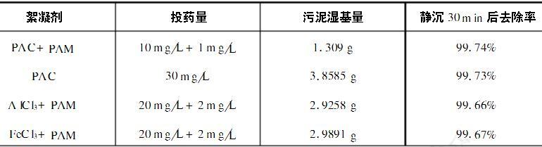 首先呢我們要對不同絮凝劑處理高濁度水絮凝效果進(jìn)行比較,我們選用不同的絮凝劑進(jìn)行實驗,實驗結(jié)果看表1,由此可以看出,對于高濁度水處理PAC單獨(dú)使用效果很好,PAC與PAM結(jié)合使用效果最為突出,不僅濁度去除效果最好,并且污泥濕基量最低。因此我們建議使用絮凝劑PAC與PAM結(jié)合使用處理高濁度水。