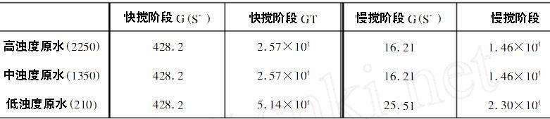 采用文獻(xiàn)水處理技術(shù).1996,22(3),157-161上方法計算了不同濁度水在快攪階段和慢攪階段的G值和GT值,見表3。